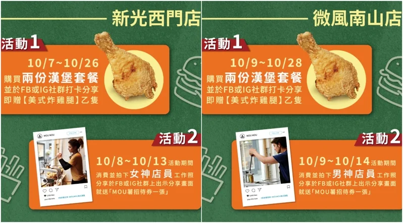 MOUMOU台南新光西門店於10/7開幕,緊接著是MOUMOU台北微風南山店將於10/9上午11點開幕,自開幕日起連續20天舉行漢堡派對,凡於FB或IG社群打卡,購買兩份漢堡套餐送「美式炸雞一隻」;此外,開幕首7日,消費並拍下「男神店員/女神店員」工作照分享於FB或IG社群上,就送「MOU薯招待券一張」。